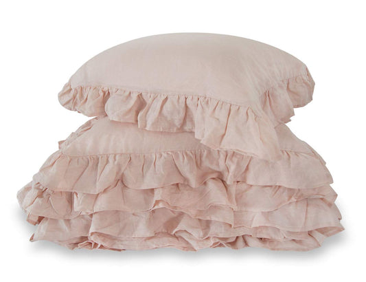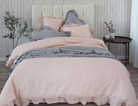 meadow park Stone Washed French Linen Duvet Cover Set 3 Pieces- Super Soft, Queen Size 90" x 94" - Shams 20" x 26", Ruffled Style - Button Closure - Corner Ties, Pale Pink Color