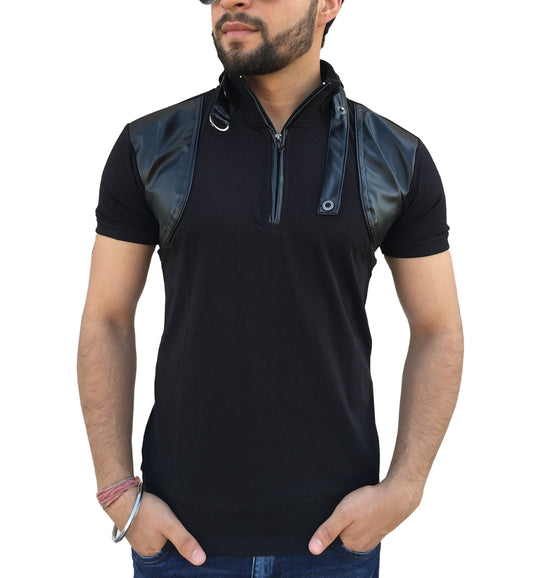 Tees Collection Men's Stylish Leather Flap Dragon Neck T-Shirt (Black_TCLF001)