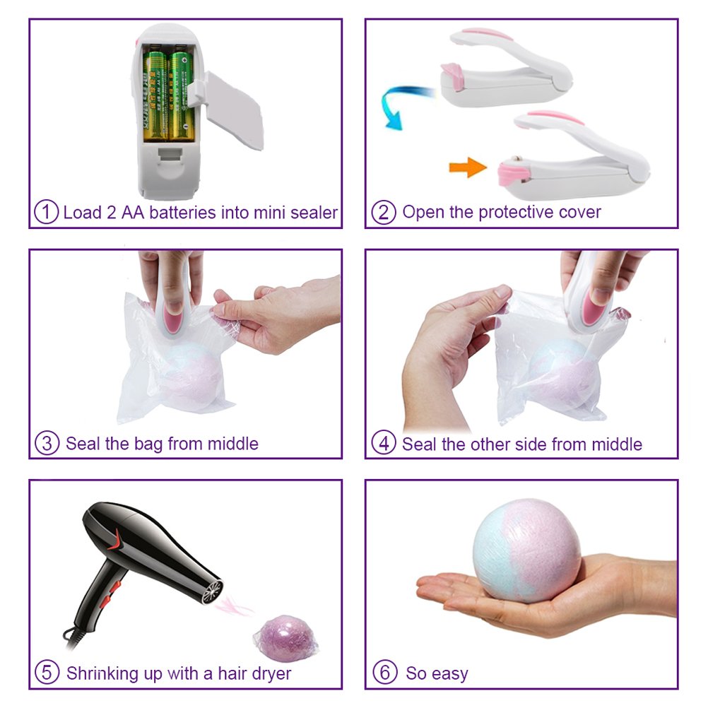 Tired of buying expensive bath bombs - Customize your own bath bombs that mixed creative recipes with our bath bomb molds from now on! - Save your money and enjoy the weekend of crafting with family and friends. How to use the bath bomb mold -Step 1: Fill both sides of molds with mixture until they overflow a little,you may add some petals or lavenders into molds; -Step 2: Press both sides together and use a lot of pressure to compact the mixture firmly into the molds; -Step 3: Whisk away the excess mixtures around the molds,please do not rotate the mold; -Step 4: Tap the mold around slightly with a spoon; -Step 5: Gently remove one side of the mold, then gently invert the bath bomb so the uncovered side is facing down, then gently remove the other half of the mold from the top. Tips: 1.Please don't hit the molds with metal spoons; 2.Not suitable for use in a dishwasher. How to use the mini sealer -Step1: Put your craft into the shrink wrap bag; -Step2: Press two sides of the mini sealer together for 5 seconds to preheat before using it; -Step3: Seal the open and cut off the excess of the bag with the mini sealer; -Step4: Shrink up the craft with a heat gun or hair dryer; -Step5: Finished until the shrink wrap bags surround the craft completely. Tips: 1.Please put the protective cover on before loading the batteries into the sealer; 2.Please do not touch the heat slice directly to avoid burning.The heat slice will produce high temperature when you press two sides together; 3.Please cover the protection cap and take out the batteries after using the sealer.