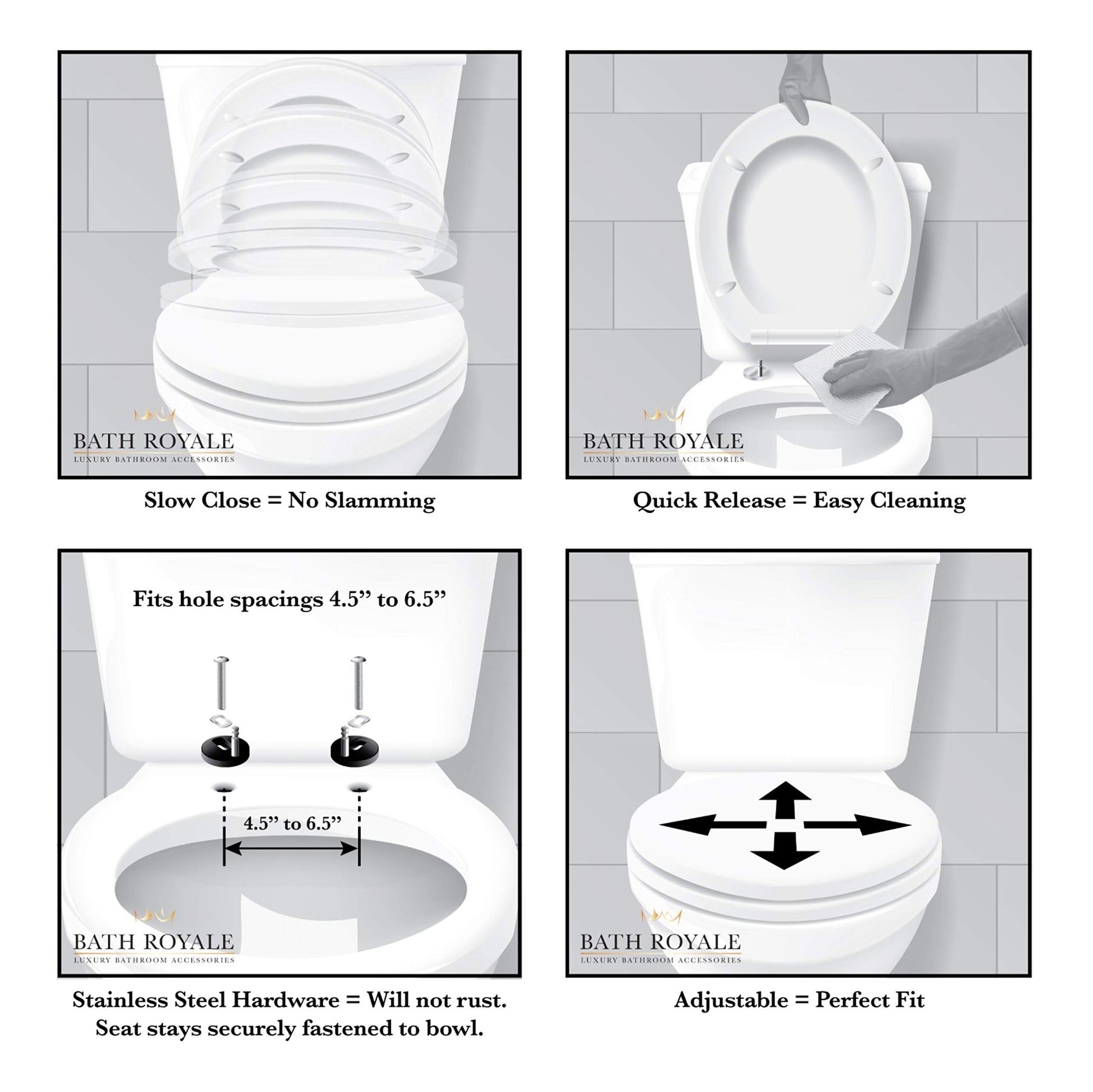 • BEFORE YOU ORDER, measure your toilet bowl (see diagram at left) to determine if you need ROUND or ELONGATED seat. Bath Royale seats FIT ALL TOILET BRANDS including Kohler, American Standard, Toto, Crane, Eljer, Caroma, etc. Also fits toilets with non-standard mounting hole spacings 4-7 inches. NOTE: NOT compatible with bidets that install between seat and bowl.