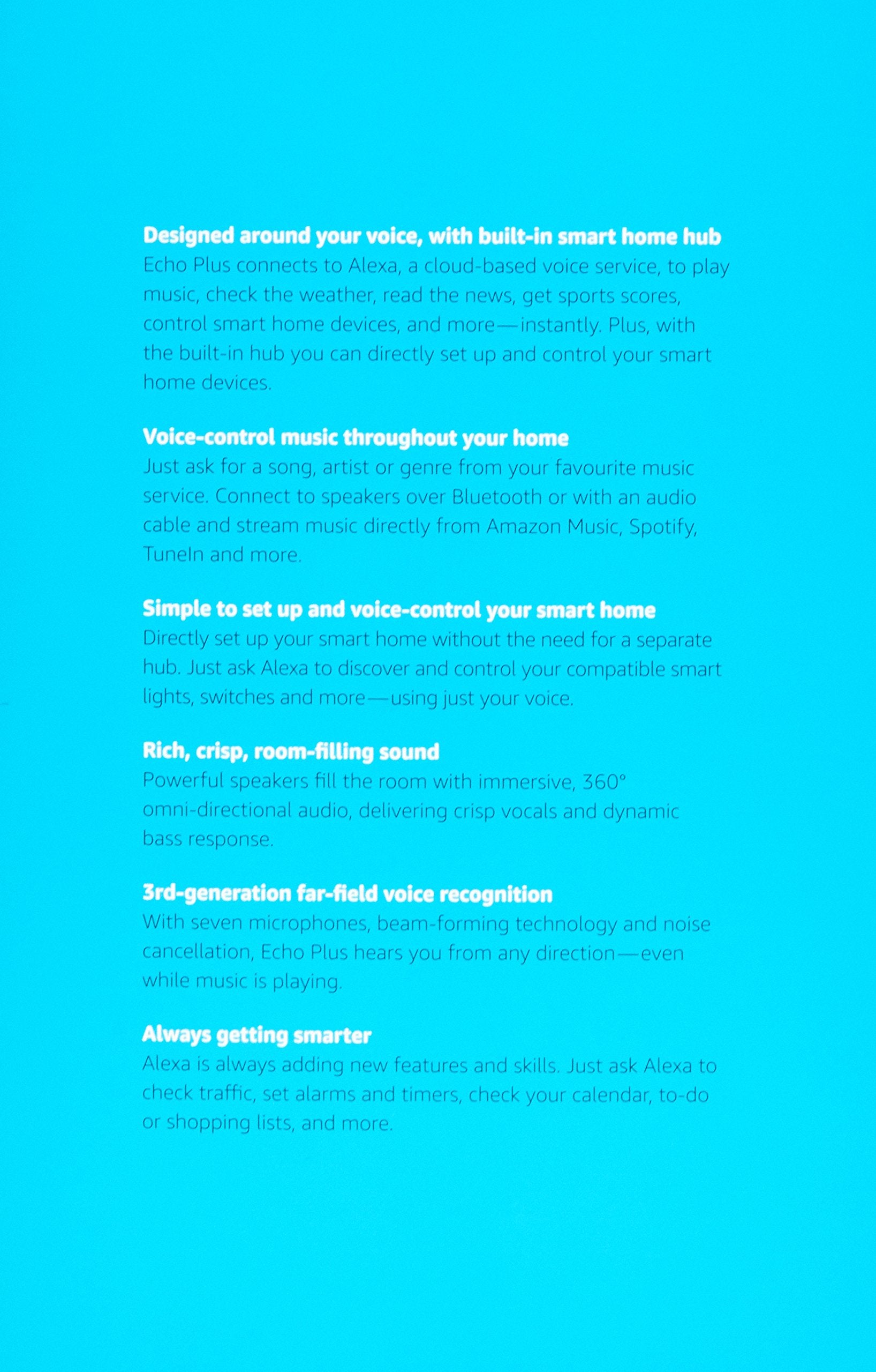 • Echo Plus connects to Alexa, a cloud-based voice service, to play music, make calls, set timers and alarms, ask questions, check traffic and weather, and more. Just ask.